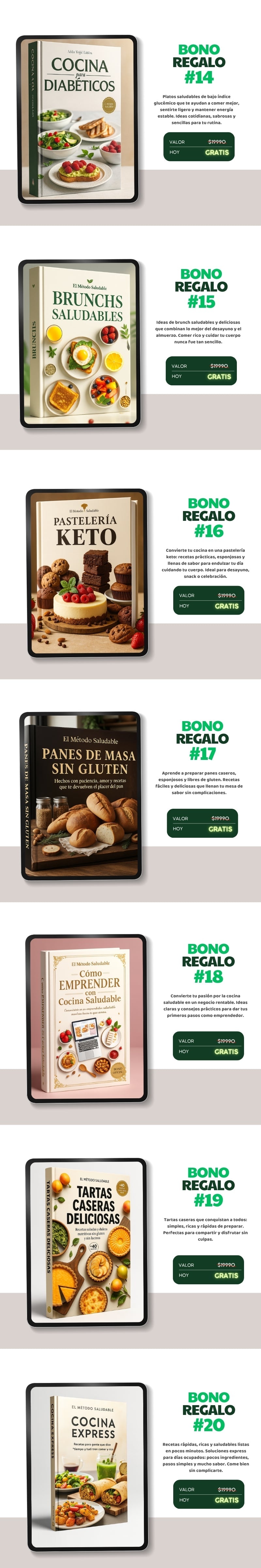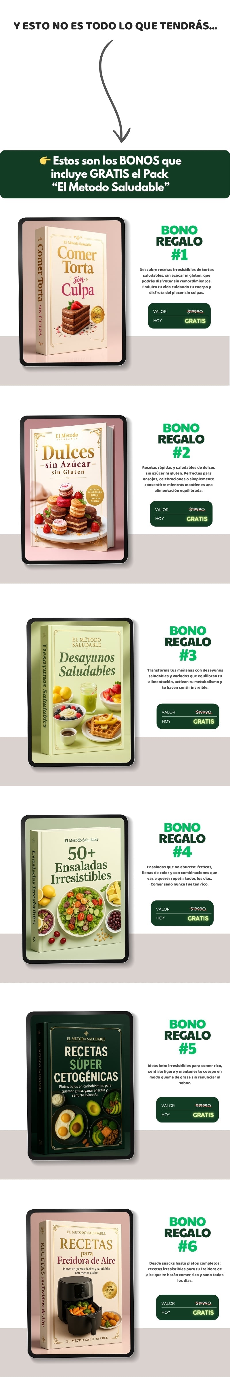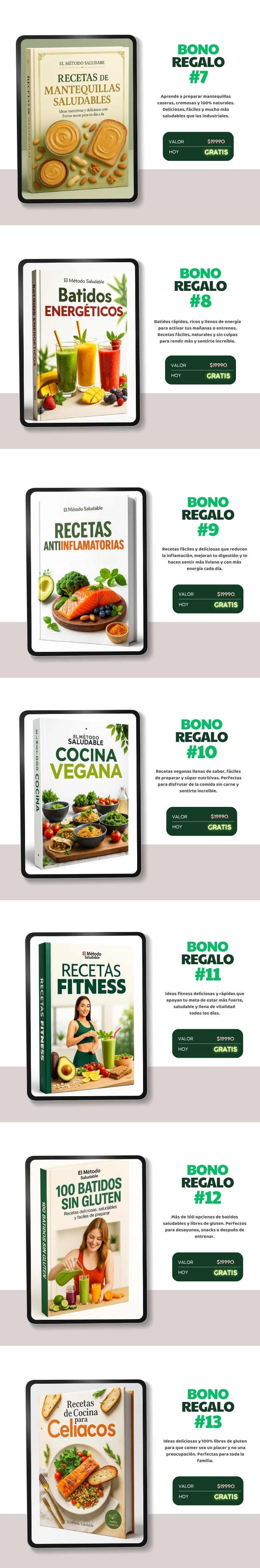 Recibirás un ebook en formato PDF, listo para usar en todos tus dispositivos. Incluye recetas, menús y guías prácticas para transformar tu alimentación desde el primer día. Tendrás acceso a todos los bonos gratuitos y los materiales se pueden leer desde el celular o la computadora.